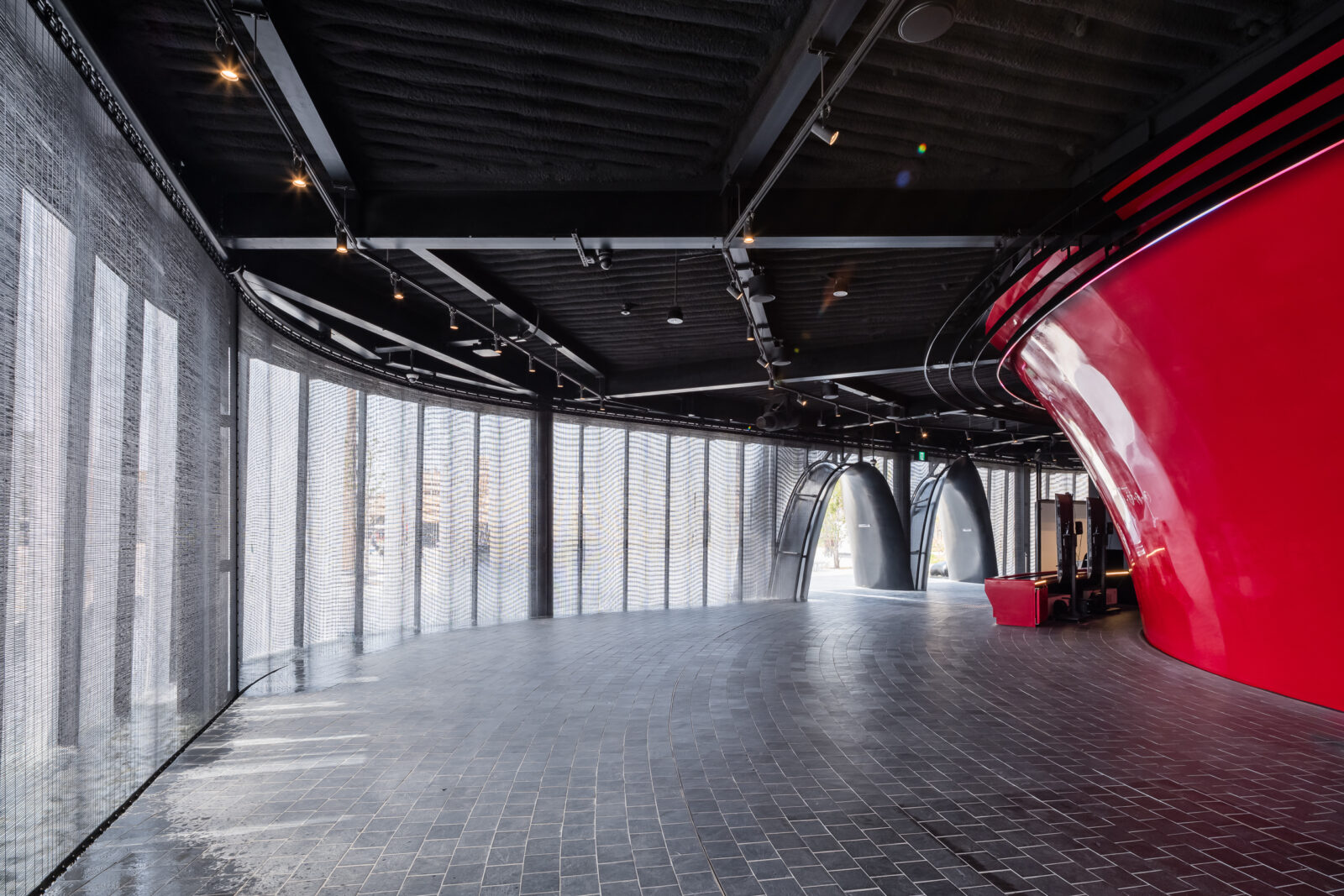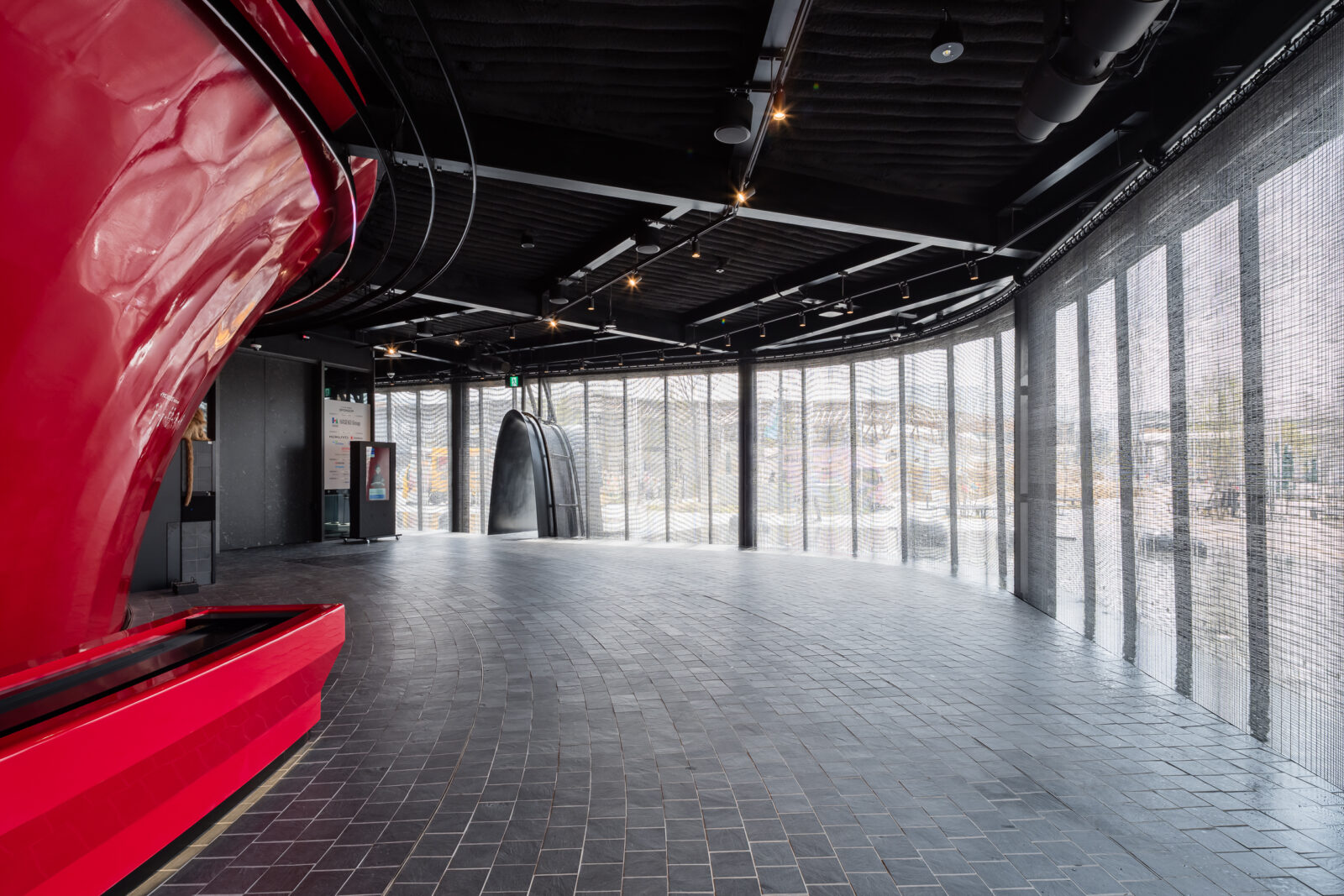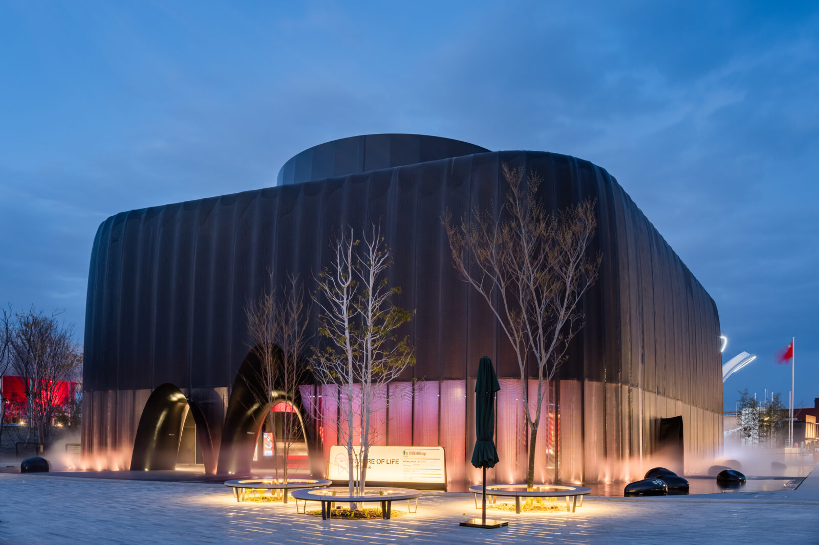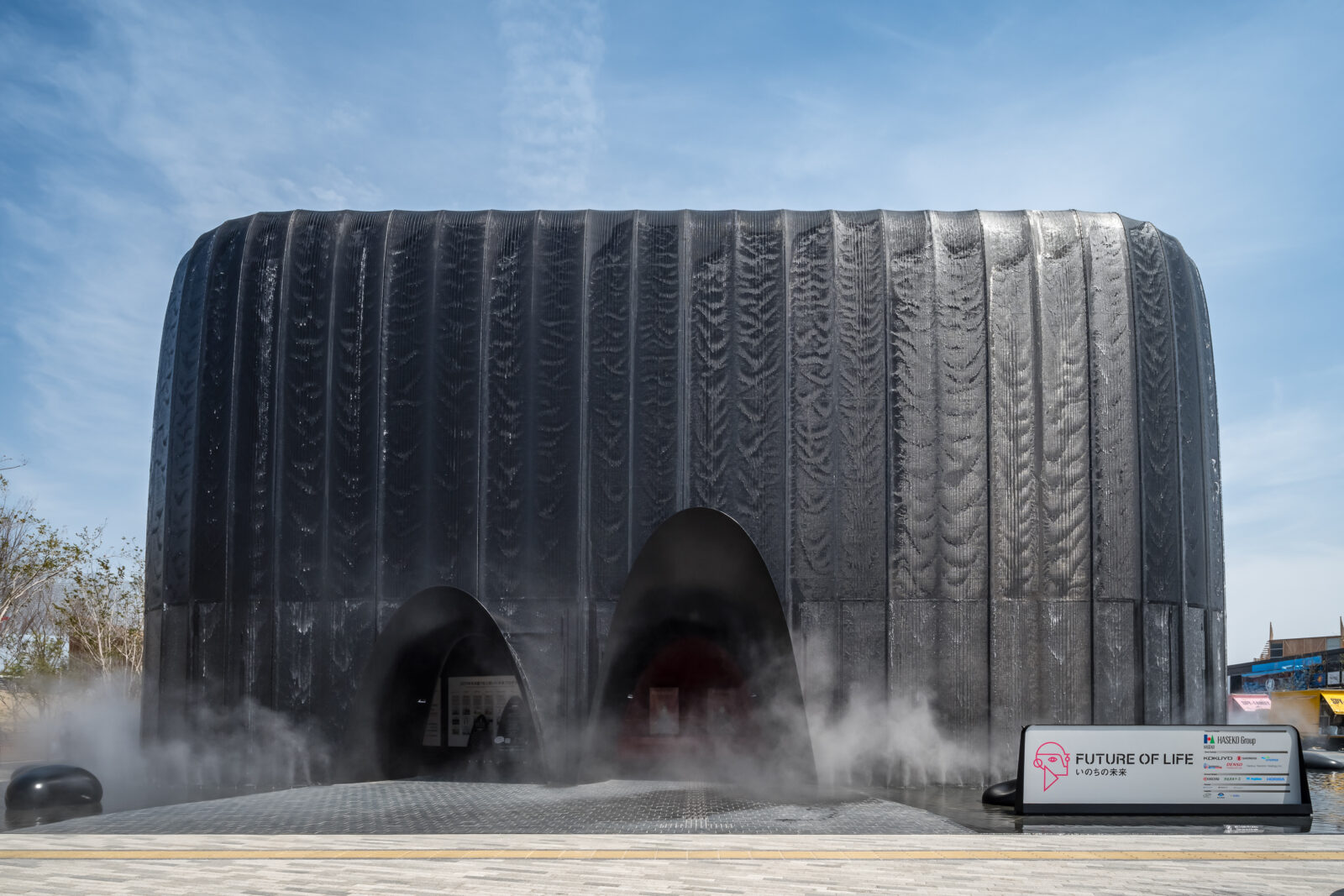 建築の外観は、いのちの象徴である水や渚をモチーフとして設計され、建築が生命感を纏うような外観を目指して、ろ過循環する水が黒いメッシュ膜の外壁面を流れ落ちる設計とした。内部空間では、循環する水に囲まれた1階に受付を配置し、その先に、古来より日本人がいのちを宿してきた様々なものを解説する導入展示「いのちの歩み」を設けた。次に2階へ向かうエスカレーターを配置し、中心的な展示「50年後の未来」へ導いた。ここではアンドロイドやロボットと共に生きる未来を体験させる様々なシーンを設計した。その後には1階へ降りる暗がりの階段を前室として、「1000年後のいのち”まほろば”」を設け、未来の人間を表現する美しいアンドロイドを演出するため、この空間の天井を建築高さ最大まで高く設計した。来館者はここで、プロデューサーからのメッセージ「人は自ら未来をデザインし、生きたいいのちを生きられる」を受け取り、最後は循環する水の空間に再び戻るという動線設計とした。