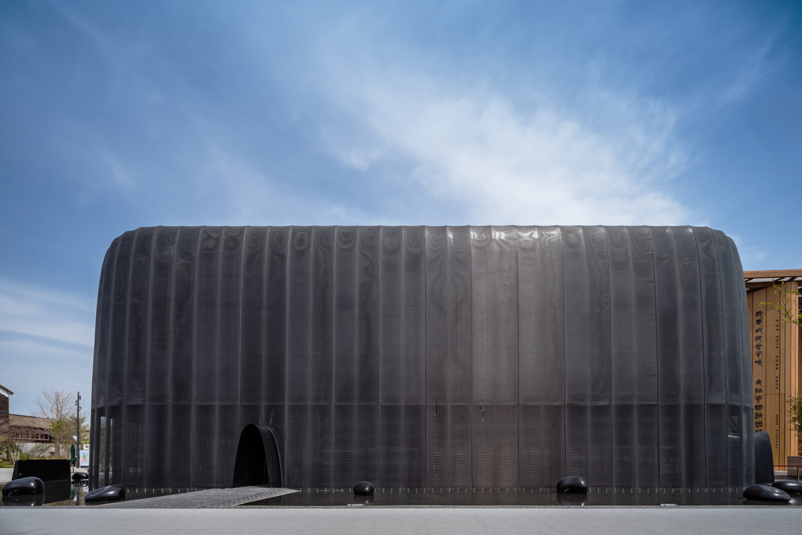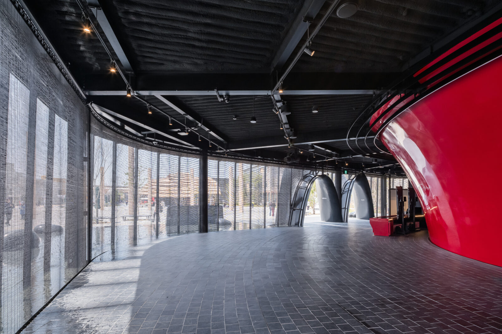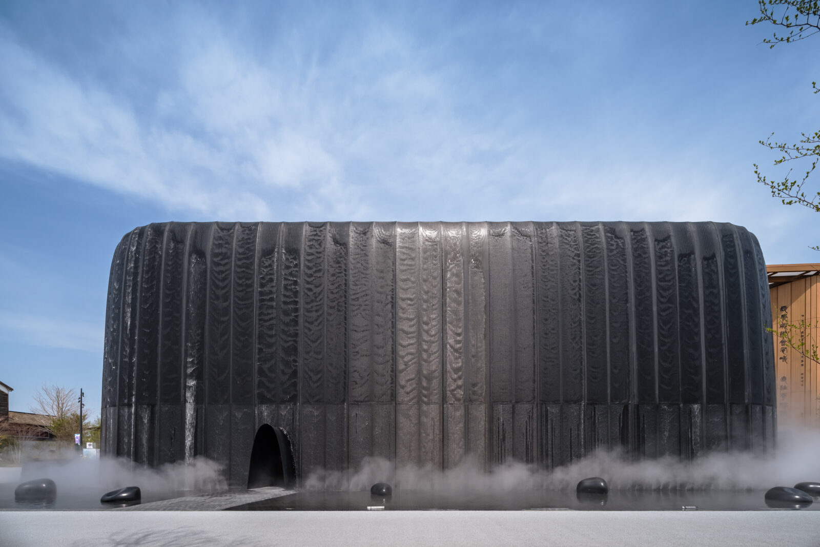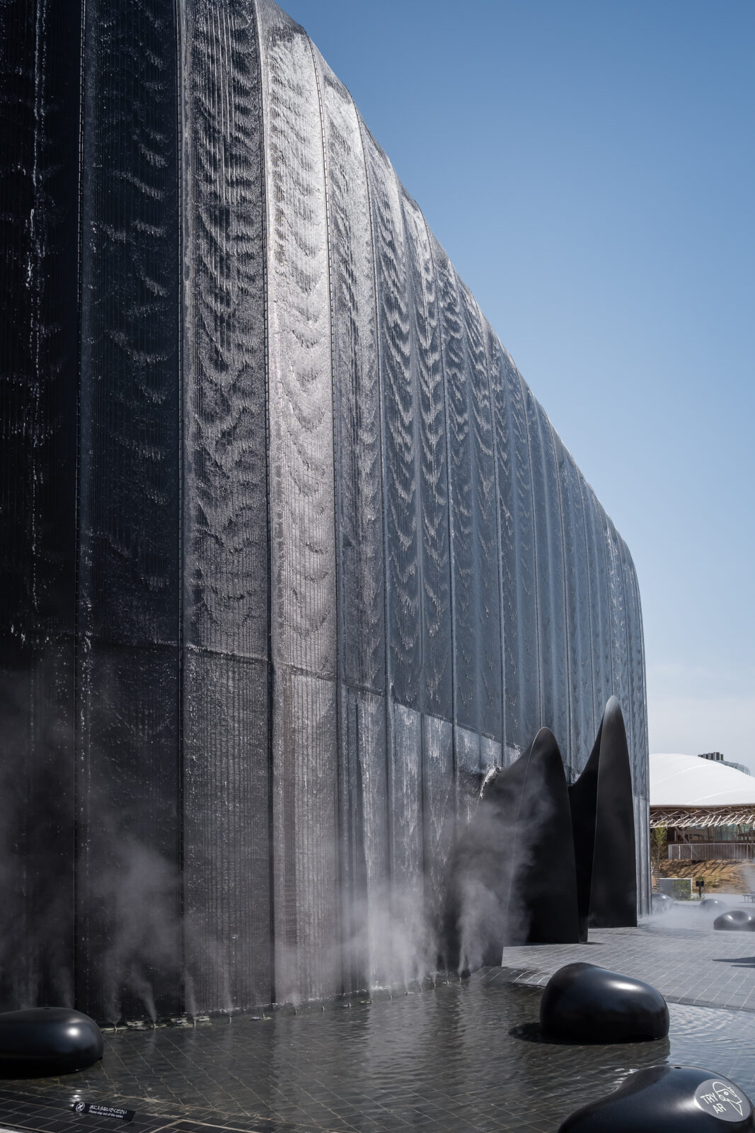 建築の外観は、いのちの象徴である水や渚をモチーフとして設計され、建築が生命感を纏うような外観を目指して、ろ過循環する水が黒いメッシュ膜の外壁面を流れ落ちる設計とした。内部空間では、循環する水に囲まれた1階に受付を配置し、その先に、古来より日本人がいのちを宿してきた様々なものを解説する導入展示「いのちの歩み」を設けた。次に2階へ向かうエスカレーターを配置し、中心的な展示「50年後の未来」へ導いた。ここではアンドロイドやロボットと共に生きる未来を体験させる様々なシーンを設計した。その後には1階へ降りる暗がりの階段を前室として、「1000年後のいのち”まほろば”」を設け、未来の人間を表現する美しいアンドロイドを演出するため、この空間の天井を建築高さ最大まで高く設計した。来館者はここで、プロデューサーからのメッセージ「人は自ら未来をデザインし、生きたいいのちを生きられる」を受け取り、最後は循環する水の空間に再び戻るという動線設計とした。